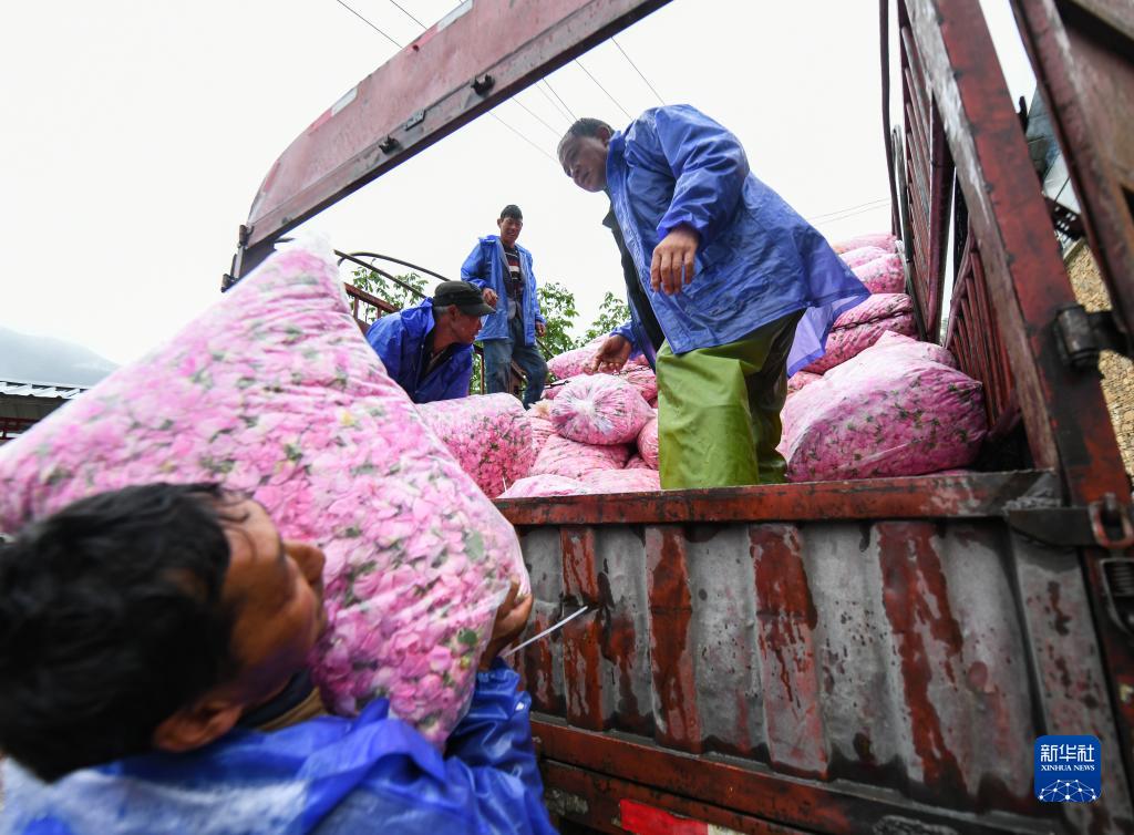 6月14日,在四川省阿壩州小金縣新橋鄉共和村,當地種植戶將售出的玫瑰鮮花裝車。