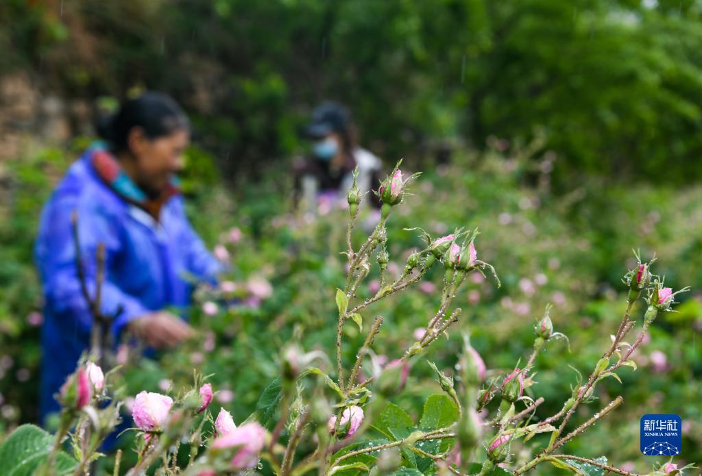 6月14日,在四川省阿壩州小金縣新橋鄉共和村,當地種植戶在采摘玫瑰鮮花。