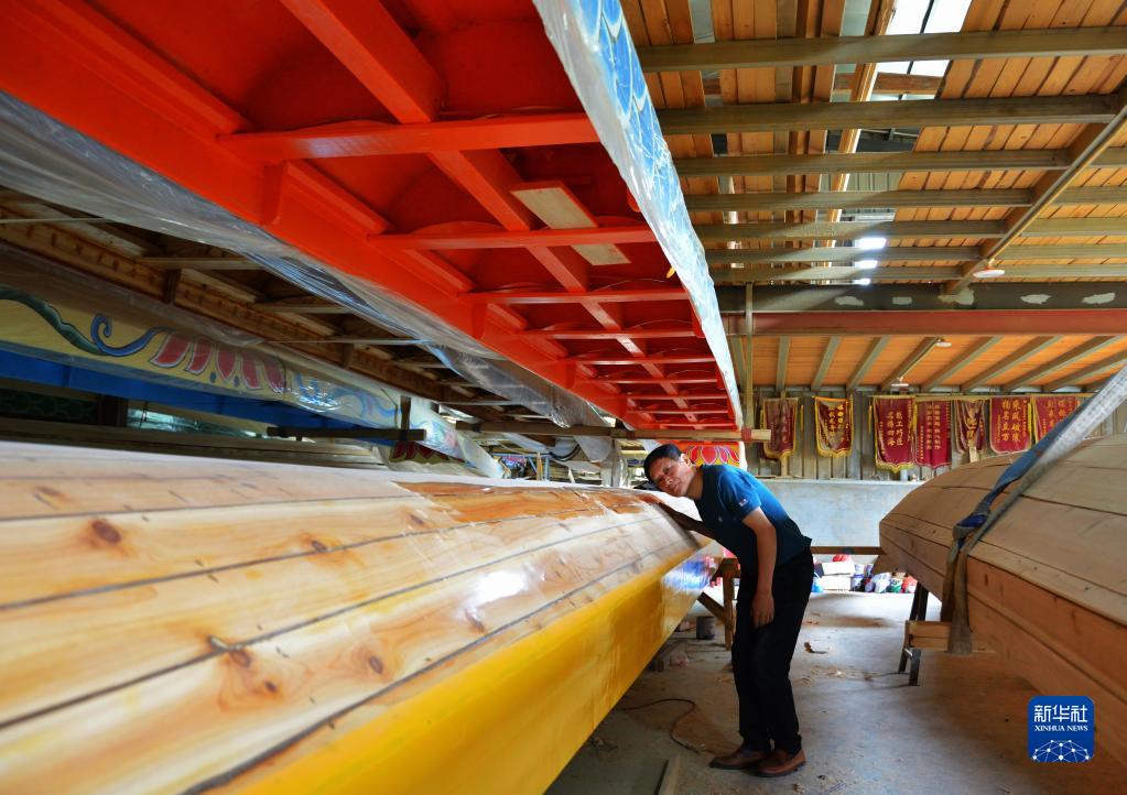 在福州市閩侯縣方莊村“龍舟世家”方忠雄龍舟廠,福州市非物質文化遺產“方莊龍舟制造技藝(閩侯縣)”傳承人方紹晃查看傳統龍舟(5月23日攝)。