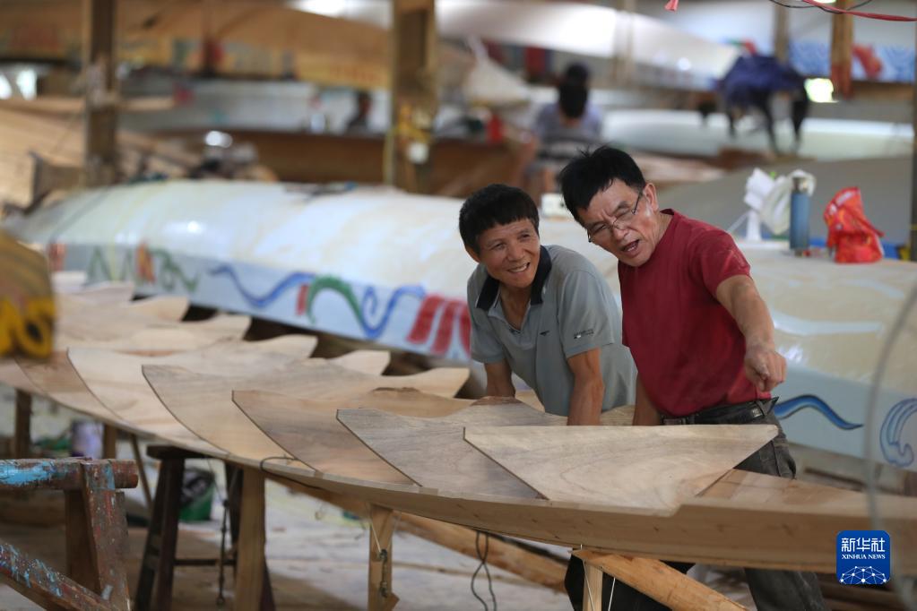 在福州市閩侯縣方莊村“龍舟世家”方忠雄龍舟廠,兩位匠人在制造龍舟時討論(6月12日攝)。