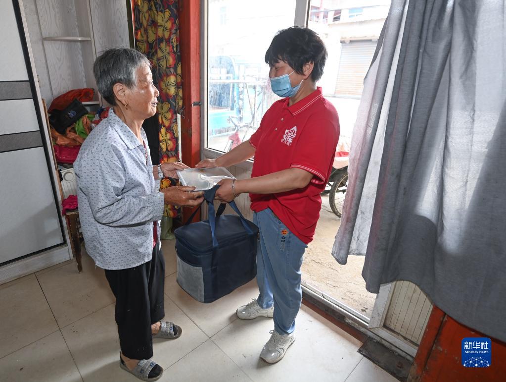 6月15日,王江涇鎮居家養老服務中心的工作人員(右)把需要配送的中餐送到老人家中。
