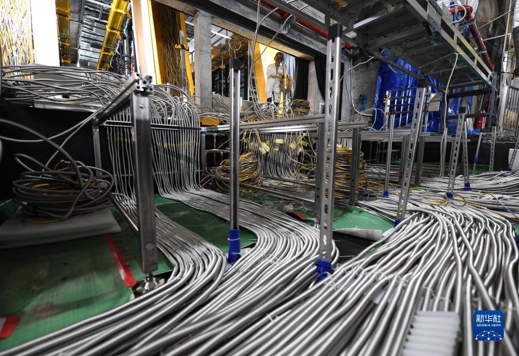 6月15日,工作人員在江門中微子實驗地下大廳內布線。