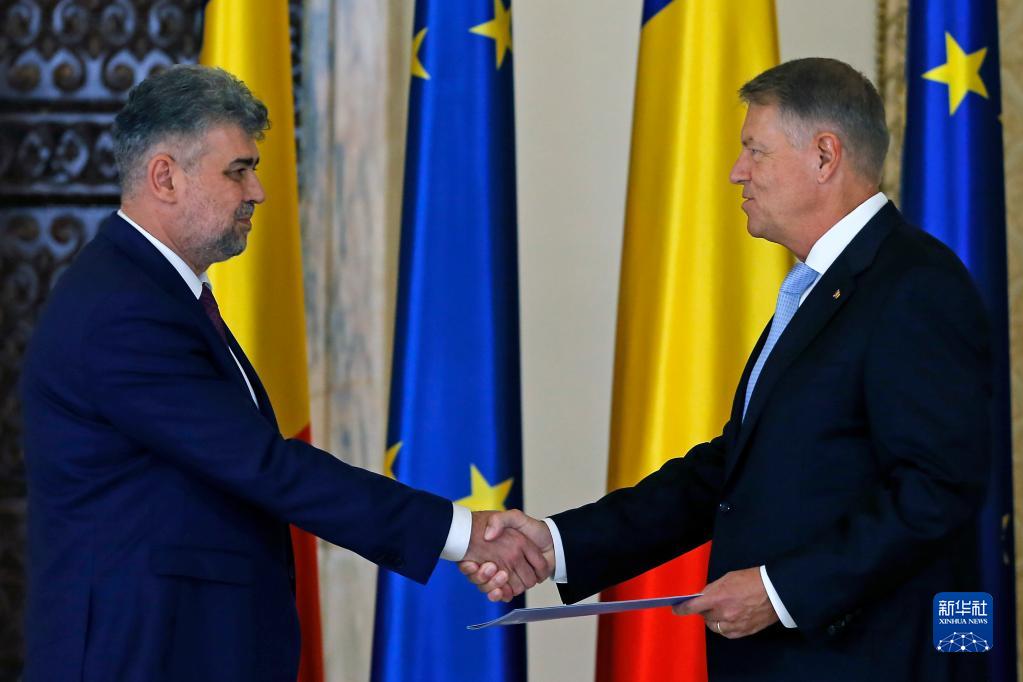 6月15日,在羅馬尼亞布加勒斯特,新任總理馬切爾·喬拉庫(左)在宣誓就職儀式上和總統約翰尼斯握手。
