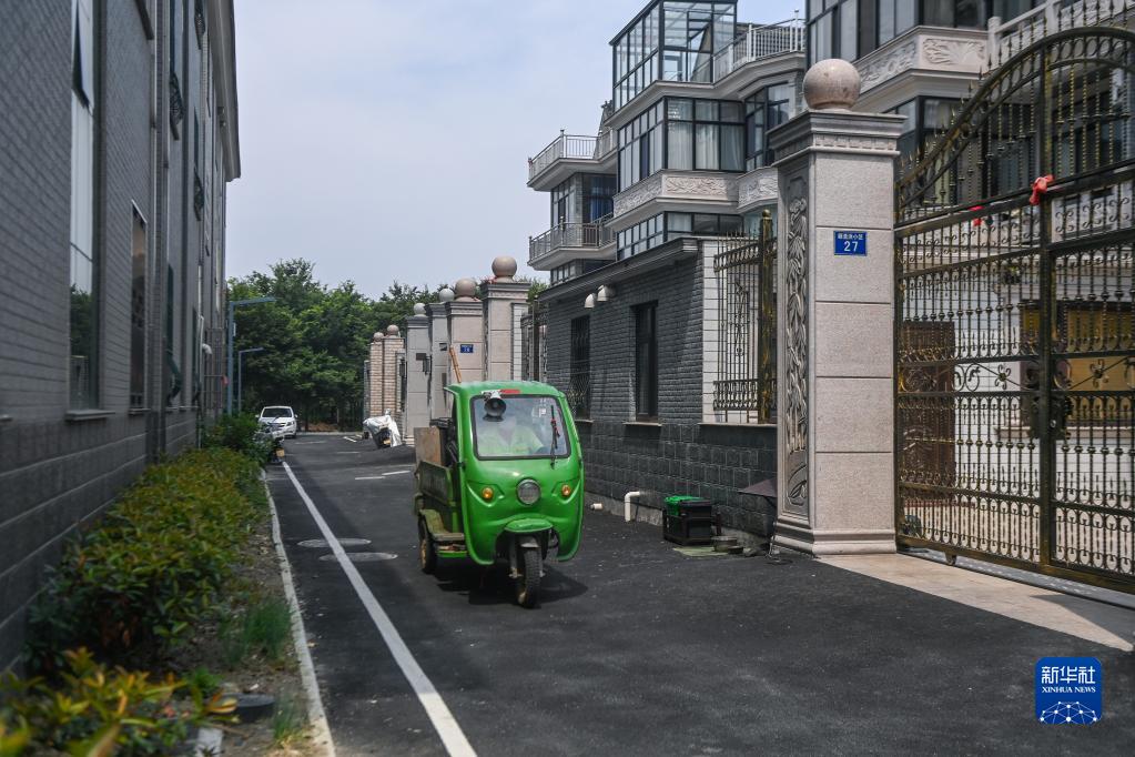 6月15日,虹南村的垃圾收集員開著垃圾收集車收集村民家門口分類垃圾桶內的垃圾。