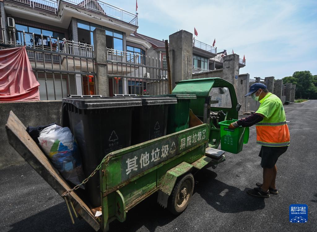 6月15日,虹南村的垃圾收集員開著垃圾收集車收集村民分類的垃圾并拍照上傳,給村民垃圾分類的準確性進行打分。