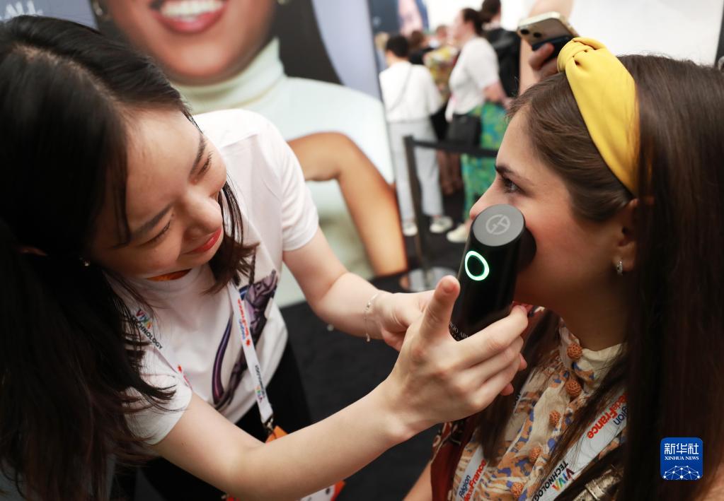 6月15日,在法國巴黎凡爾賽門展覽中心,人們在“科技萬歲”科技創新展的歐萊雅展臺體驗肌膚檢測。