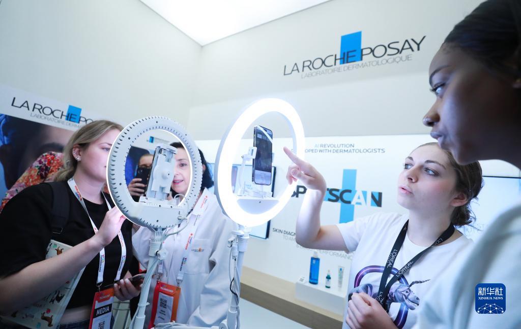 6月15日,在法國巴黎凡爾賽門展覽中心,人們在“科技萬歲”科技創新展上的歐萊雅展臺體驗皮膚檢測。