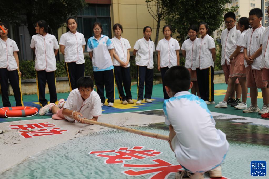 6月15日,在南昌二十八中灣里實驗學校,老師在戶外指導同學們進行淺水區竹竿救援實操。