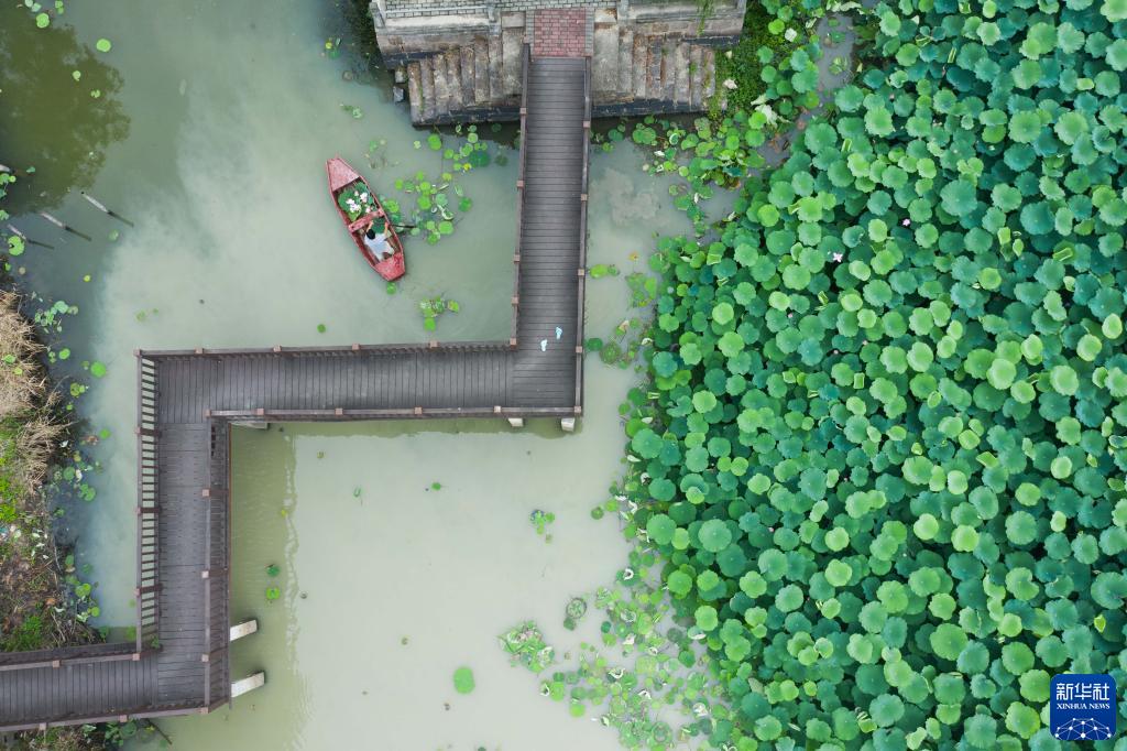 6月16日,空中俯瞰東林鎮泉心村的荷花塘。村民劃著船采收荷花、荷葉,作為鄉村旅游特色產品(無人機照片)。
