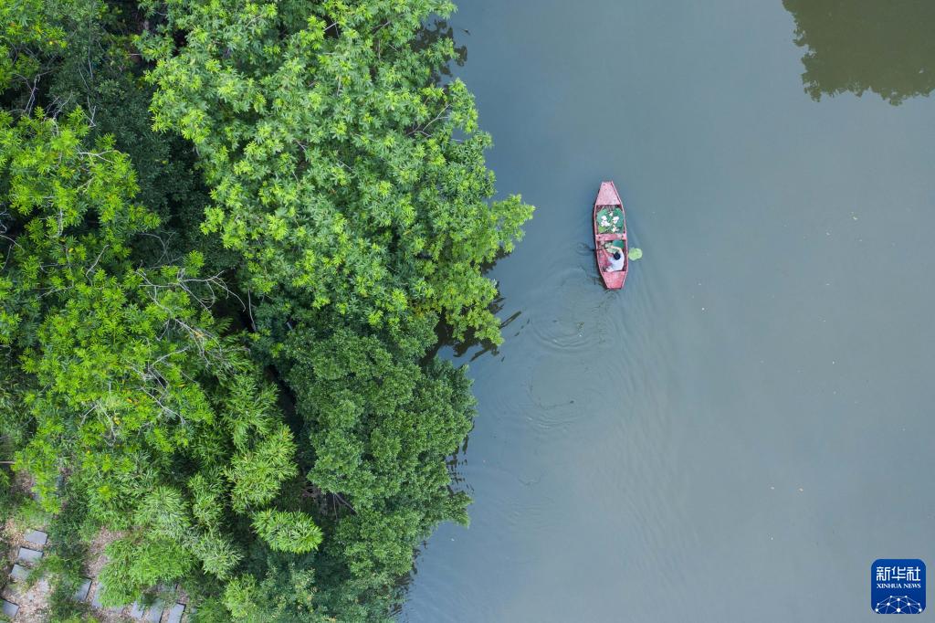 6月16日,東林鎮泉心村村民劃船行進在河道中(無人機照片)。該村利用水鄉荷塘、河道優勢,積極發展特色旅游和休閑農業,助力共同富裕。