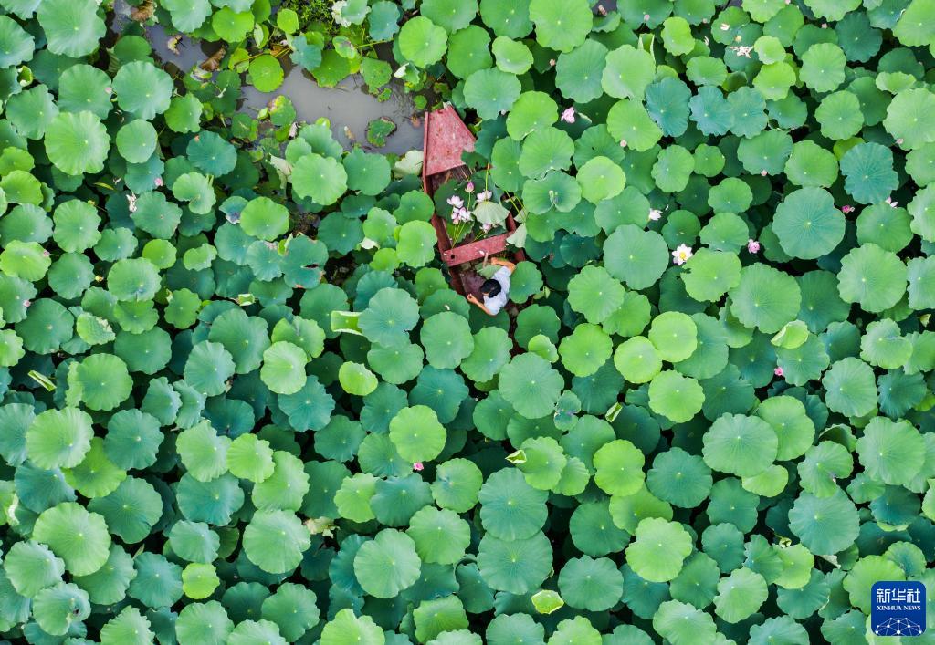 6月16日,空中俯瞰東林鎮泉心村村民劃著船采收荷花、荷葉,作為鄉村旅游特色產品(無人機照片)。