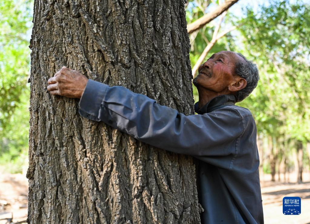 6月14日,曹扎娃懷抱一棵他親手種下的40多年樹齡的榆樹。