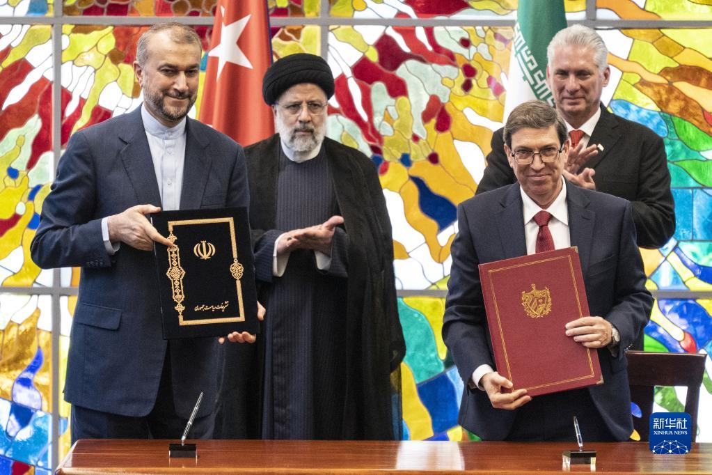 6月15日,在古巴首都哈瓦那革命宮,在古巴國家主席迪亞斯-卡內爾(后右)和伊朗總統萊希(后左)的見證下,古巴外交部長布魯諾·羅德里格斯(前右)和伊朗外交部長阿卜杜拉希揚(前左)簽署雙邊合作協議。