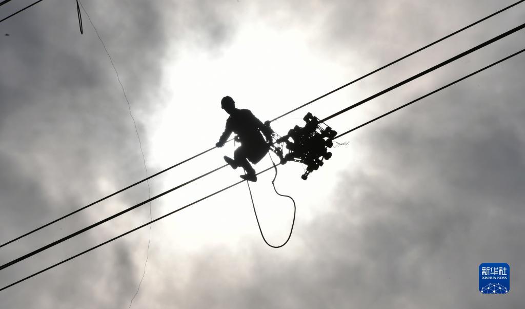 6月15日,在凌綏高速電力線路遷改工程現場,國家電網遼寧朝陽供電公司工程技術人員在安裝線上間隔棒。