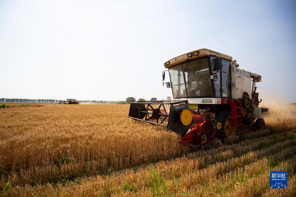 6月15日,山東省東營市廣饒縣樂安街道北朱耿村的農民駕駛收割機收獲小麥。