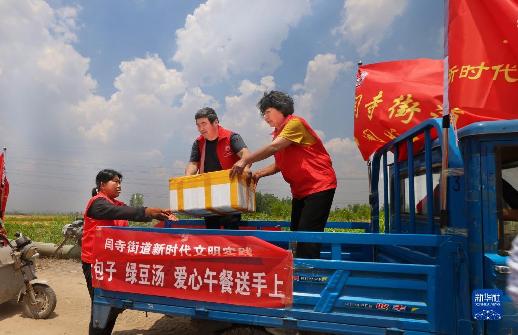 6月16日,山東省聊城市東昌府區閆寺街道辦事處的工作人員把愛心午餐送到麥收現場。