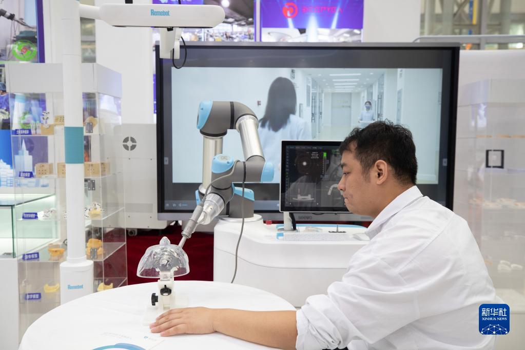 6月16日,參展商在現場操控口腔手術機器人。