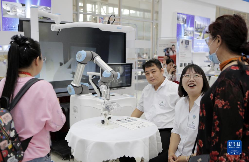 6月16日,參展商向參會者介紹口腔手術機器人。