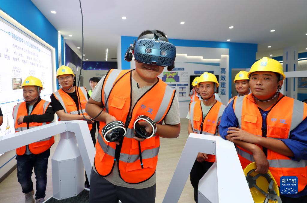 6月16日,工人佩戴VR眼鏡進行工地安全事故實景體驗。