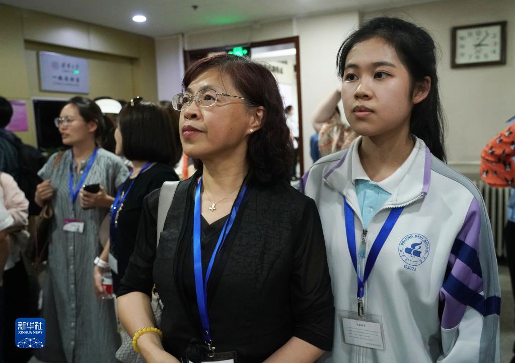 6月16日,考生代表(右一)在位于清華大學的高考數學評卷點參觀。