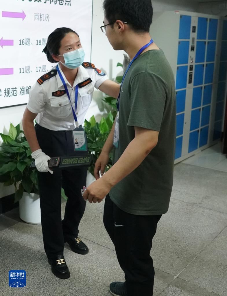 6月16日,在位于清華大學的高考數學評卷點,安檢人員對進入評卷現場的老師進行安檢。