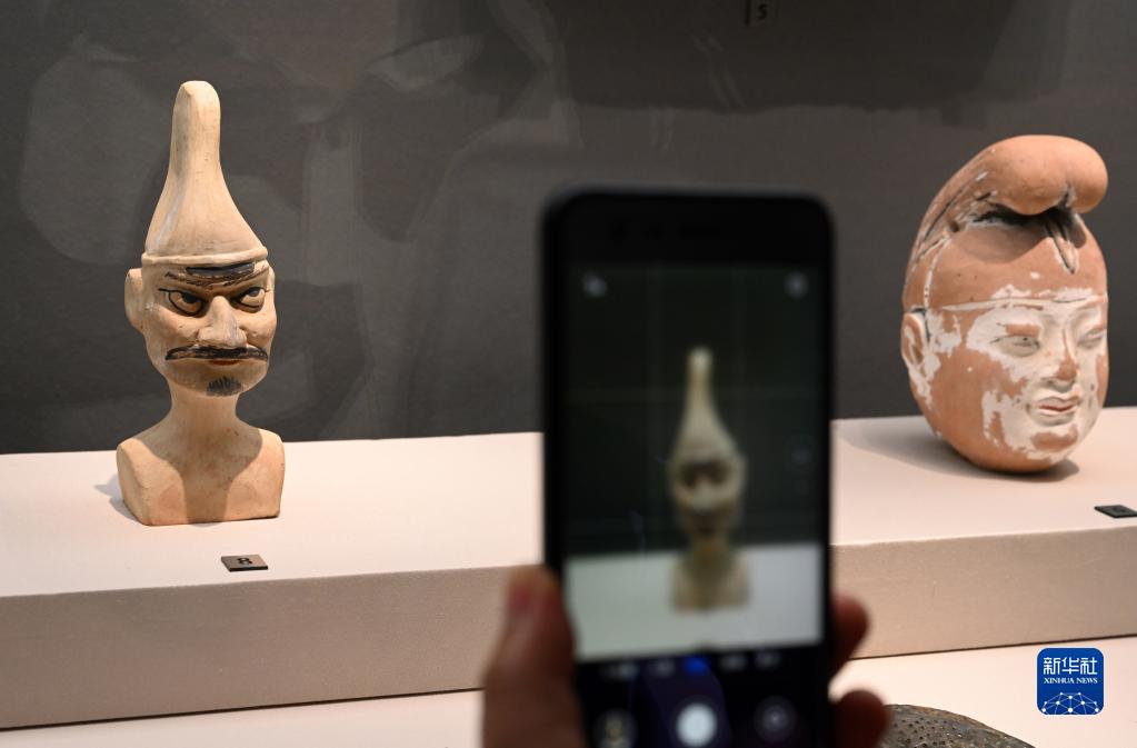 這是展出的彩繪泥塑頭俑(6月16日攝)。