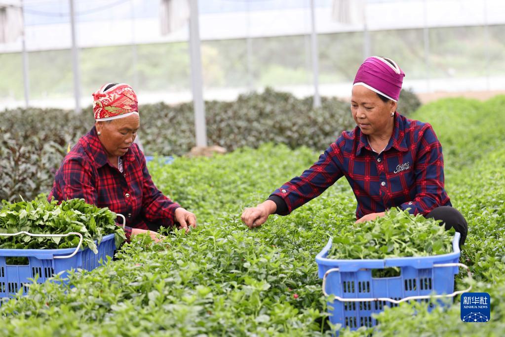 時下,在貴州省黔東南苗族侗族自治州黃平縣舊州鎮野菜種植基地,村民忙著采摘野菜,打包裝車發貨,供應訂單市場。