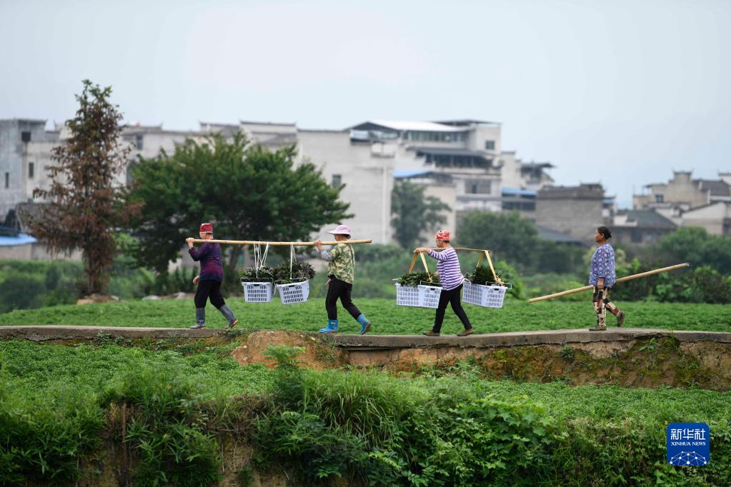 6月16日,村民在貴州省黔東南苗族侗族自治州黃平縣舊州鎮野菜種植基地挑運野菜。
