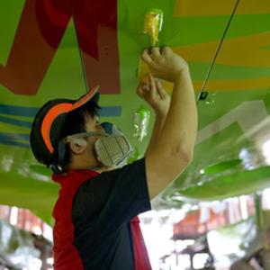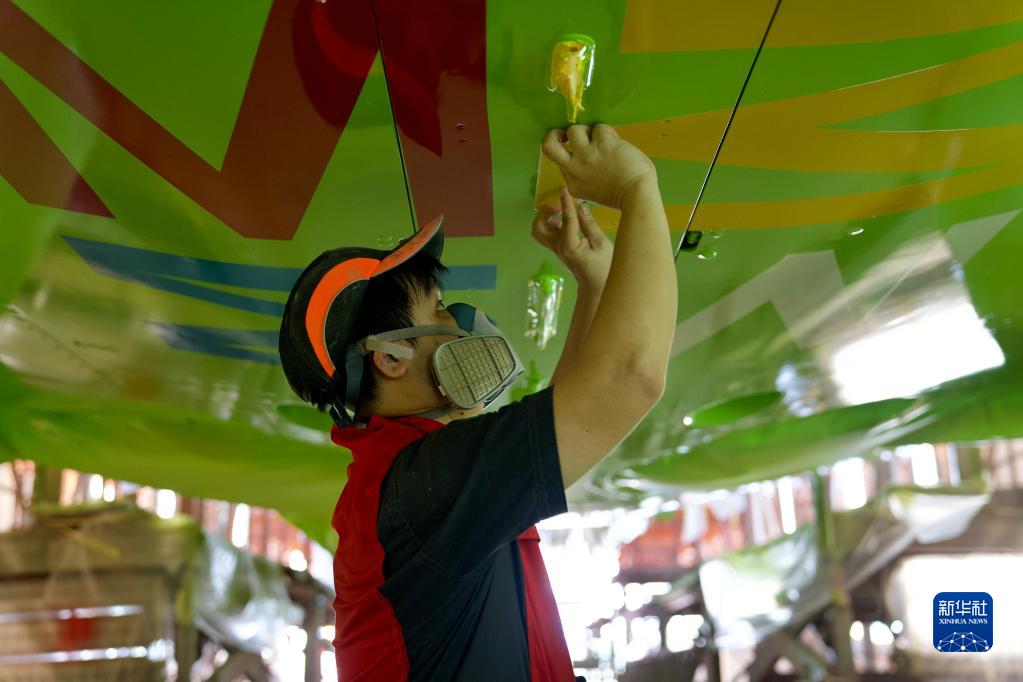 6月15日,海航斯提斯噴漆作業員在恢復機身外部標牌。