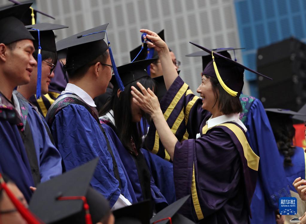 6月16日,在復旦大學2023屆研究生畢業典禮暨學位授予儀式上,復旦大學現代物理研究所的沈皓教授(右一)為畢業生撥穗。
