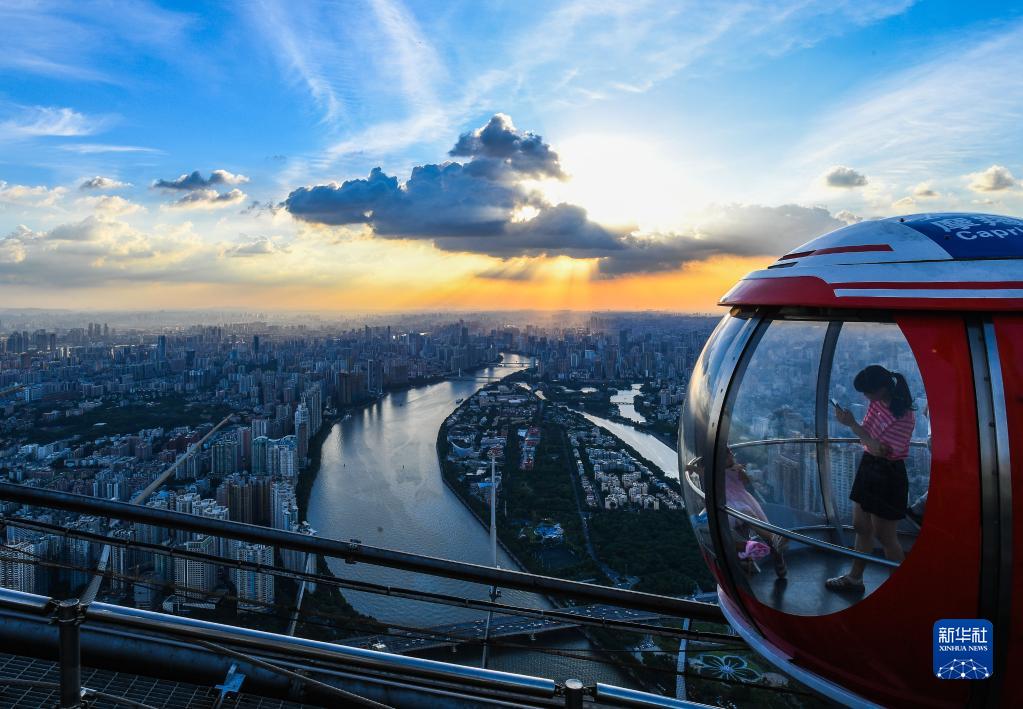 游客在廣州塔頂摩天輪觀賞珠江落日(2022年8月7日攝)。