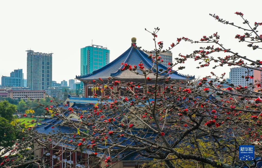 廣州中山紀念堂前,木棉花盛開(2020年2月19日攝,無人機照片)。