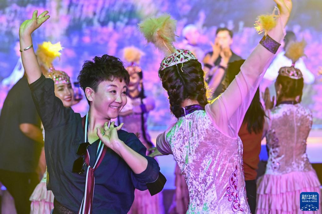 在新疆霍城縣惠遠古城,游客與舞蹈演員一起跳舞(6月16日攝)。