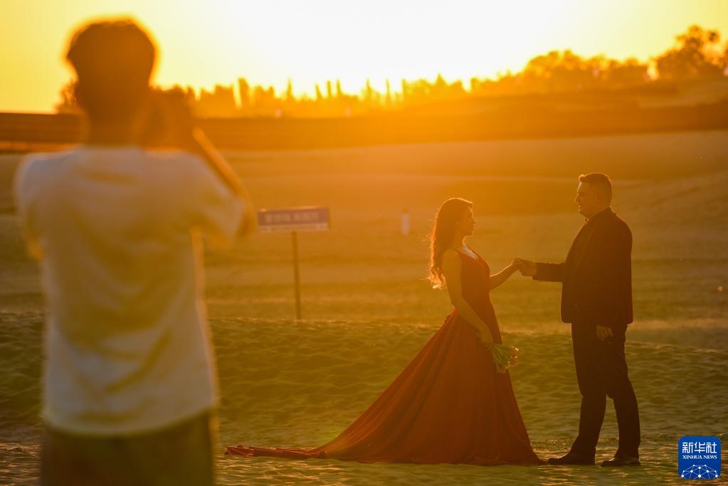 在新疆霍城縣圖開沙漠,一對情侶在拍攝婚紗照(6月16日攝)。