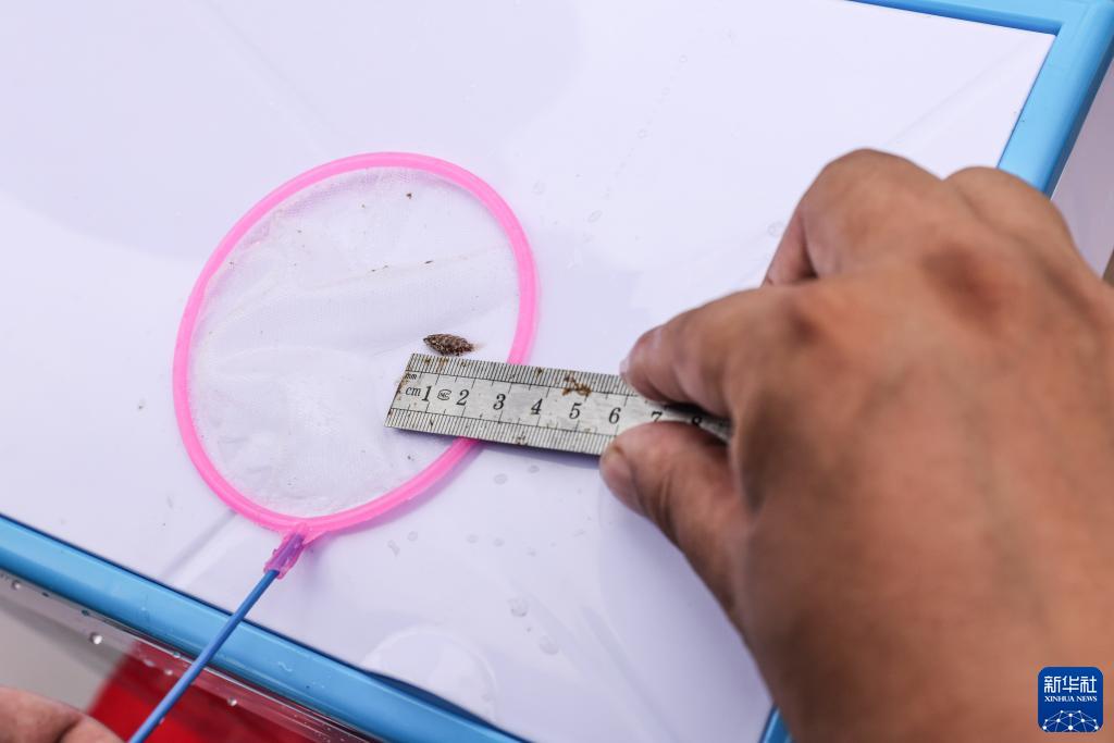 6月16日,在海南省海洋與漁業科學院瓊海長坡科研基地,工作人員測量波紋唇魚幼魚的體長、體高。