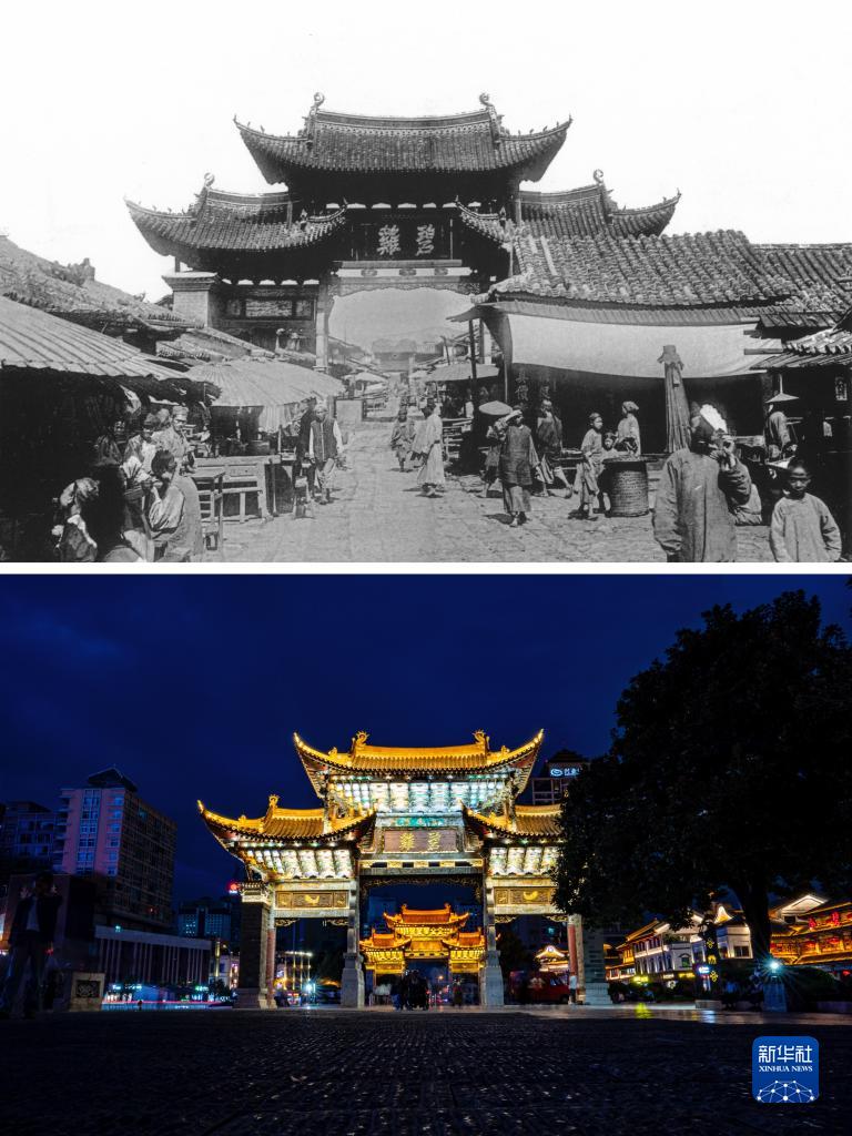 拼板照片:上圖為清末時期的昆明碧雞坊。(資料圖片 殷曉俊提供)