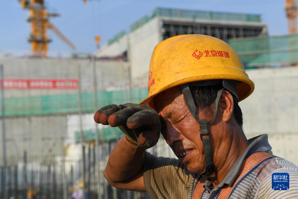 6月16日,在北京城市副中心站綜合交通樞紐項目02標段北京城建施工現場,工人在擦拭汗水。為了應對高溫天氣,工地已調整作息時間,施工時間避開了中午高溫時段。