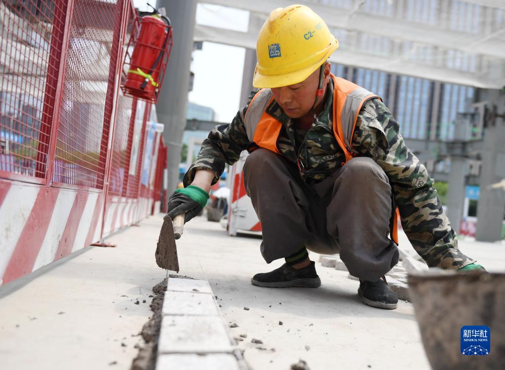 6月17日,在中建三局石景山商業金融服務業用地項目,工人在施工。為了應對高溫天氣,施工單位調整施工方案減少高溫工作時間,確保高溫下戶外勞動者的安全。