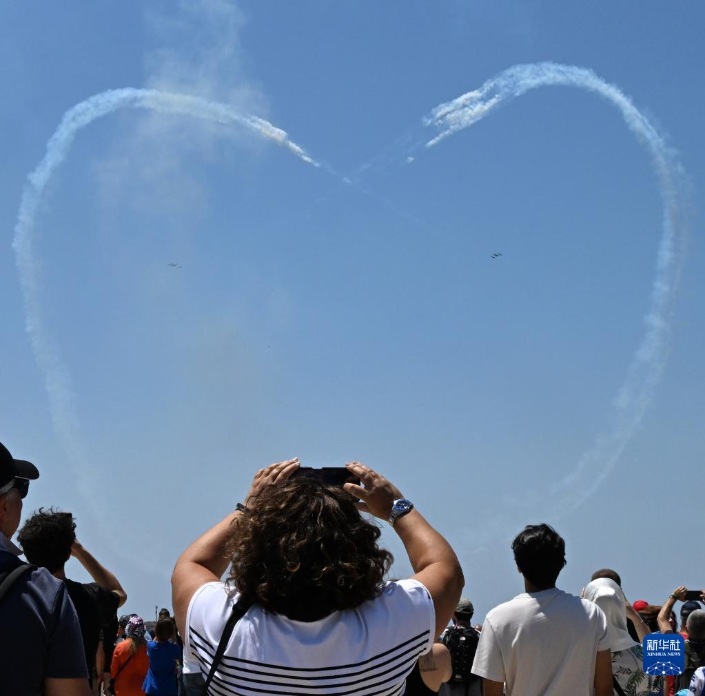 6月16日,人們在意大利普拉蒂卡迪馬雷空軍基地觀看意大利“三色箭”飛行表演隊在航空展媒體預展上的飛行表演。