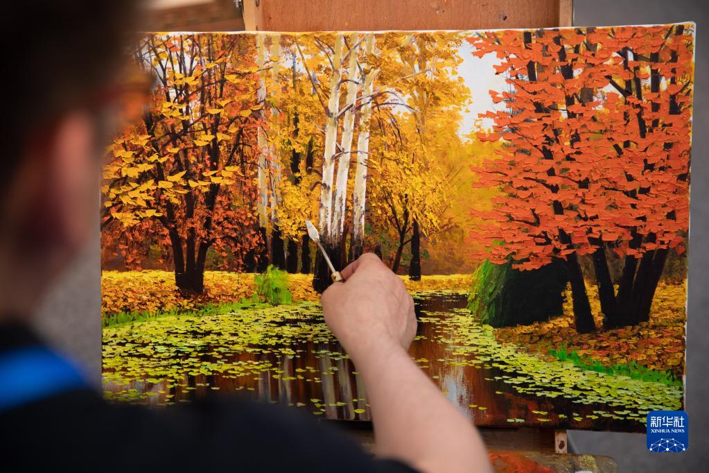 6月16日,俄羅斯畫家瓦西里在現場繪畫。