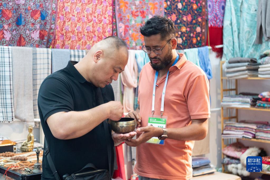 6月17日,與會者查看尼泊爾音缽。