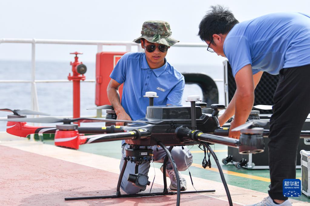 工作人員在“電科1號”綜合試驗船上調試無人機(6月15日攝)。