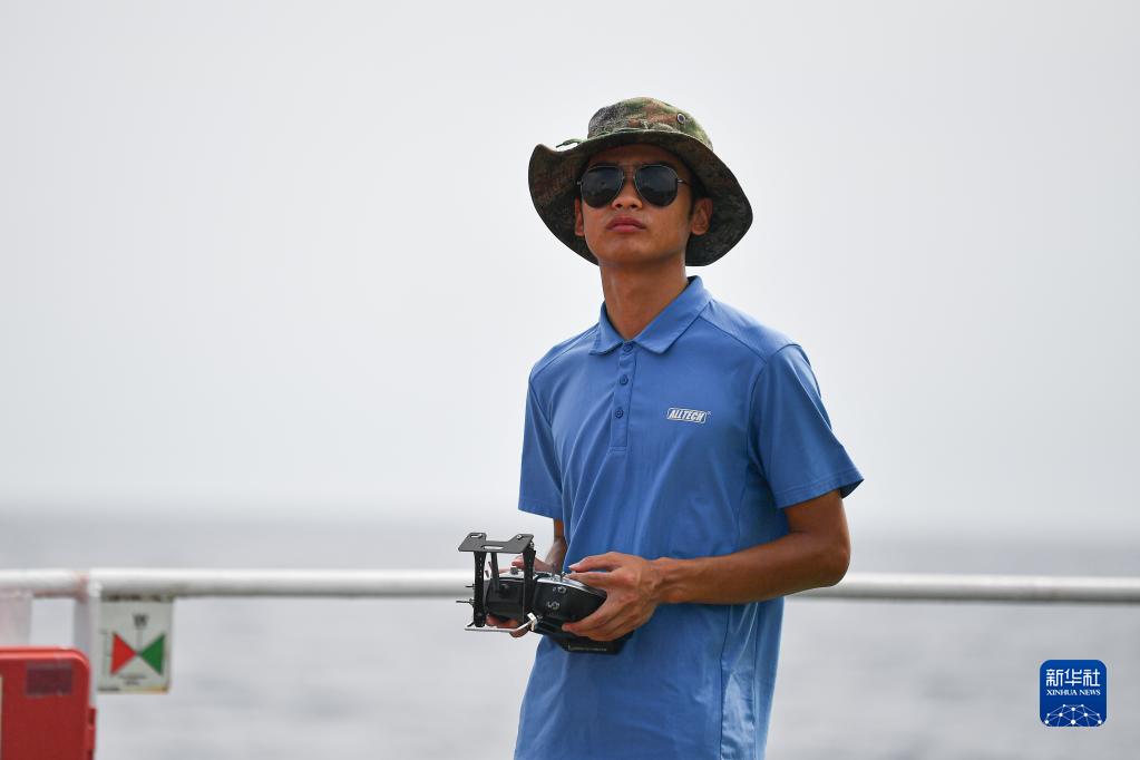 工作人員在“電科1號”綜合試驗船上操控無人機,配合此次遠海測試(6月15日攝)。