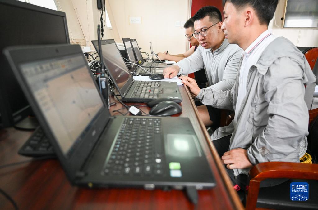 工作人員在“電科1號”綜合試驗船上驗證高低軌衛星、無人機協同通信覆蓋能力(6月15日攝)。