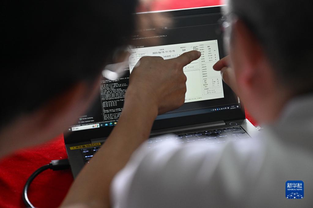 工作人員在“電科1號”綜合試驗船上驗證高低軌衛星、無人機協同通信覆蓋能力(6月15日攝)。