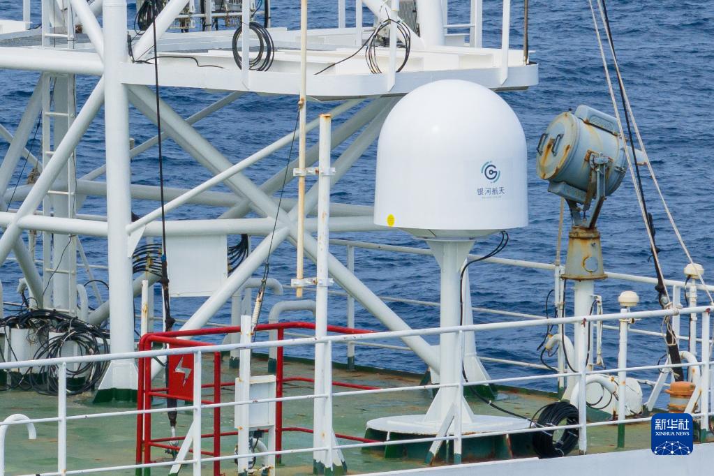 安裝在“電科1號”綜合試驗船上的船載低軌衛星互聯網終端(無人機照片,6月15日攝)。在此次測試中,該終端用于與低軌衛星進行無線通信。