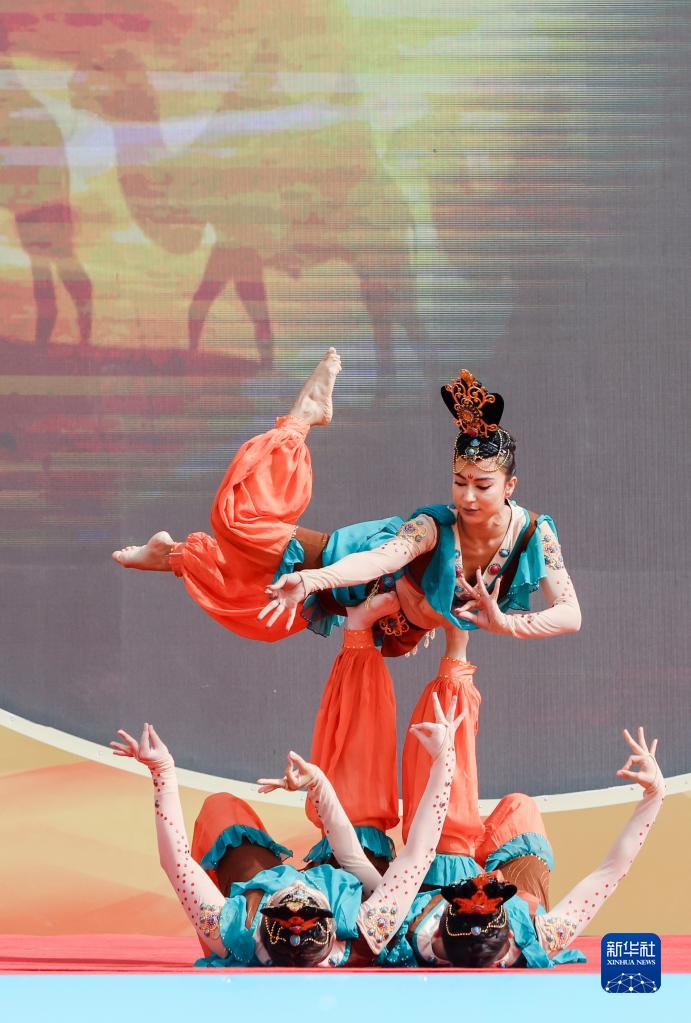 6月17日,舞蹈演員在第十九屆多浪龜茲文化旅游節開幕式上表演舞蹈《絲路夢幻》。