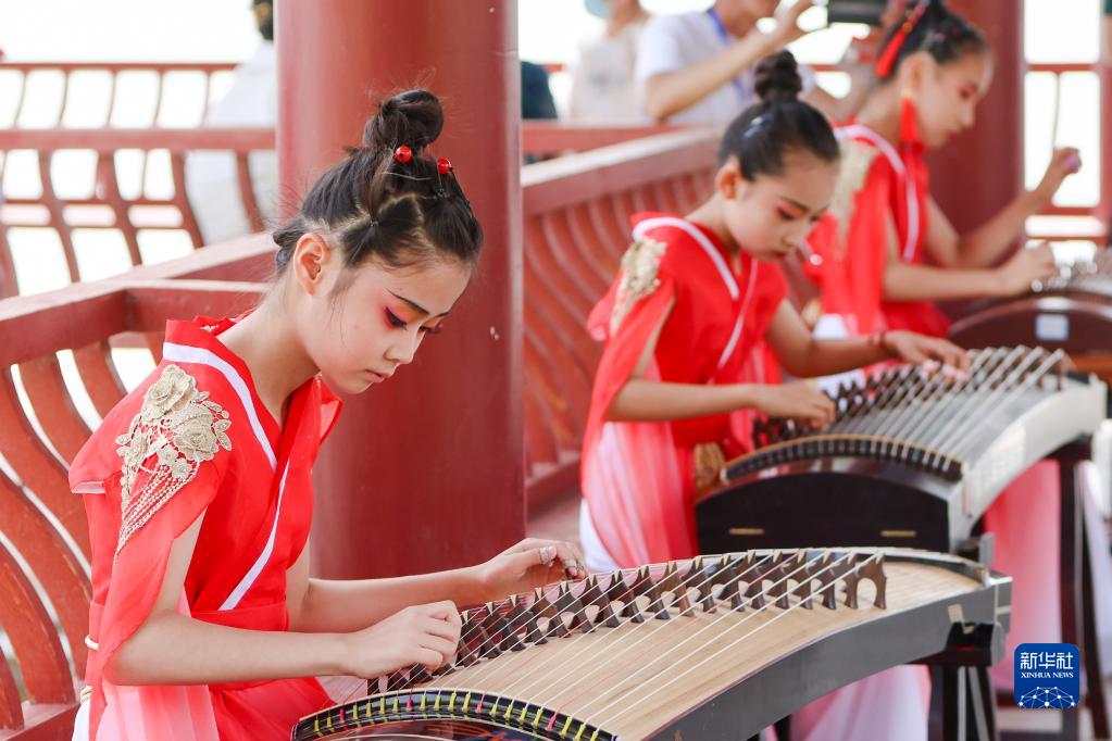 6月17日,在第十九屆多浪龜茲文化旅游節現場,小朋友在表演古箏彈奏。
