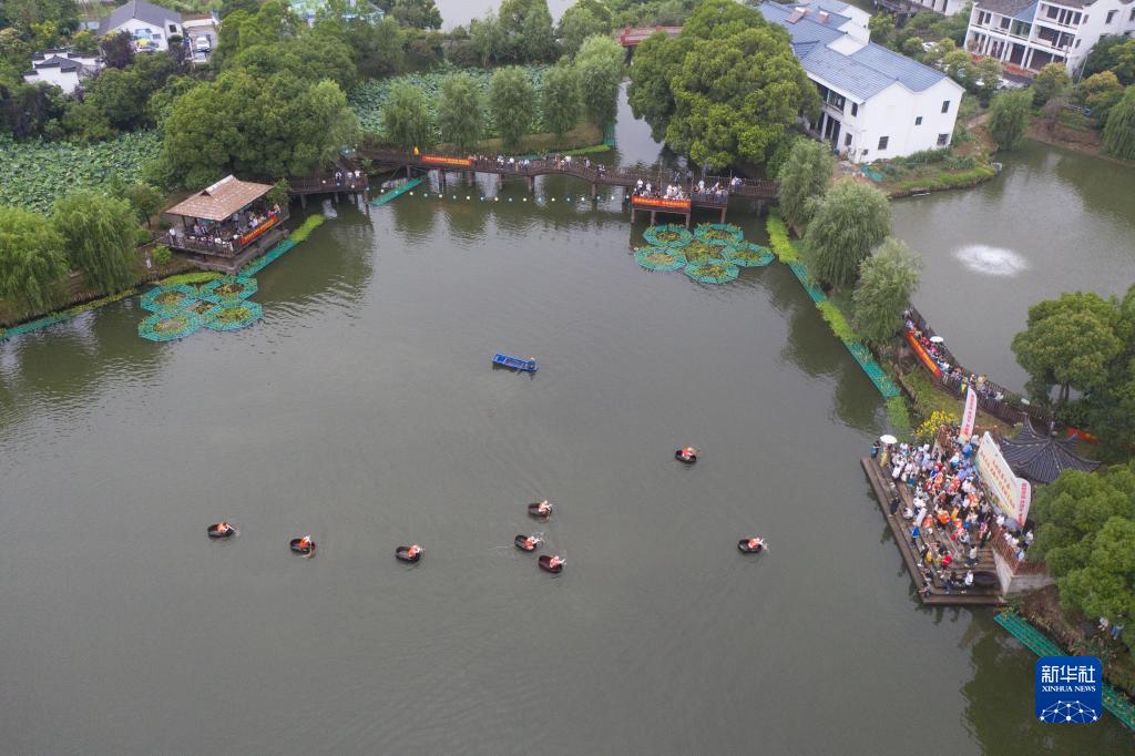 6月17日,村民們劃著菱桶在水面上參加比賽(無人機照片)。