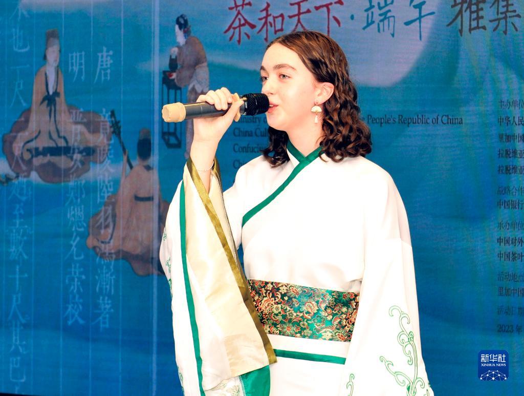 6月15日,一名拉脫維亞學生在里加舉行的“茶和天下·端午雅集”活動上演唱中文歌曲。